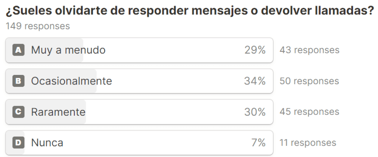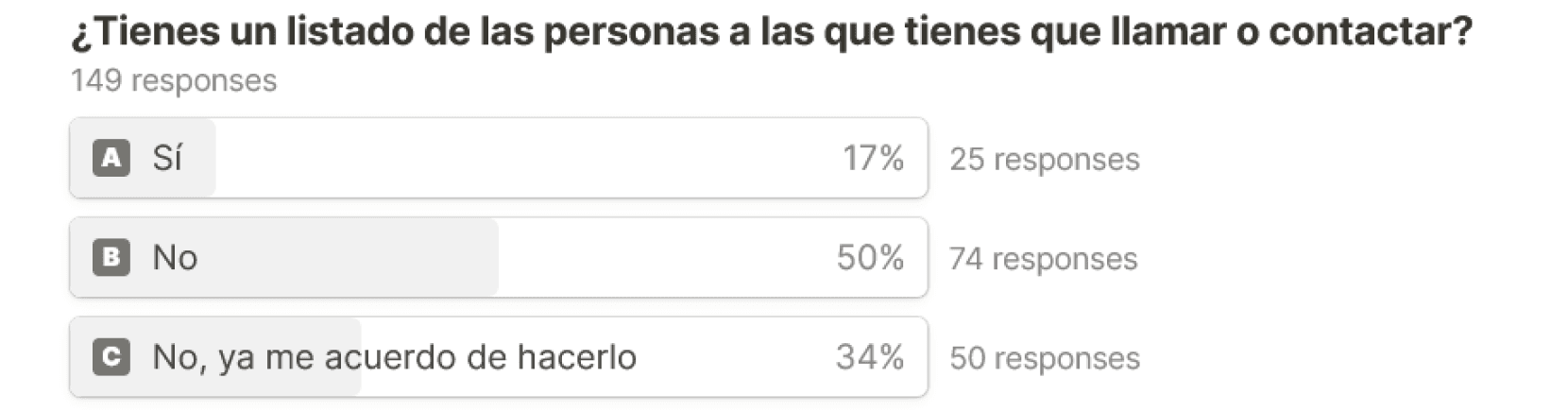 Most respondents do not keep track of the contacts they need to communicate with, and those who do lack a specific tool to manage it. This finding points to the need to create an application that facilitates the tracking of pending communications and fosters more consistent connections.