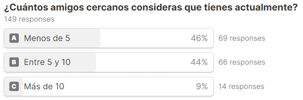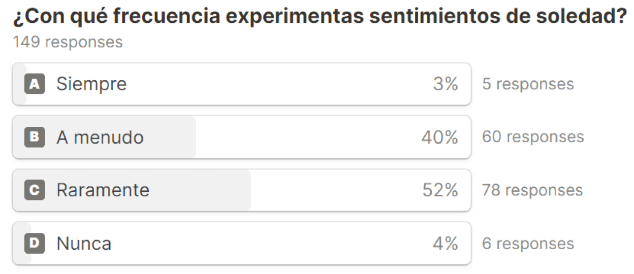 The direct question about loneliness confirmed our initial hypothesis, showing it is a widespread issue among participants. This finding validates our research direction and the development of solutions focused on connecting and alleviating loneliness.