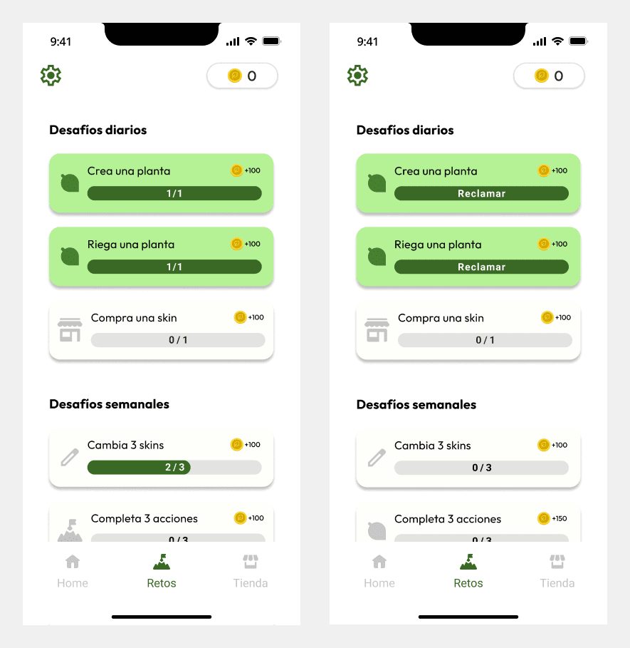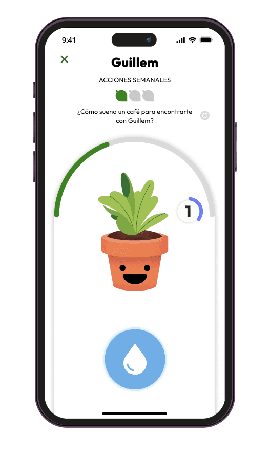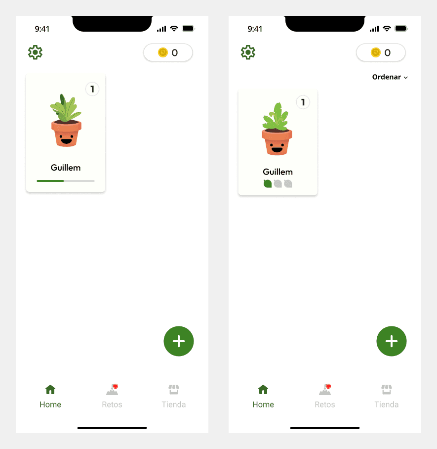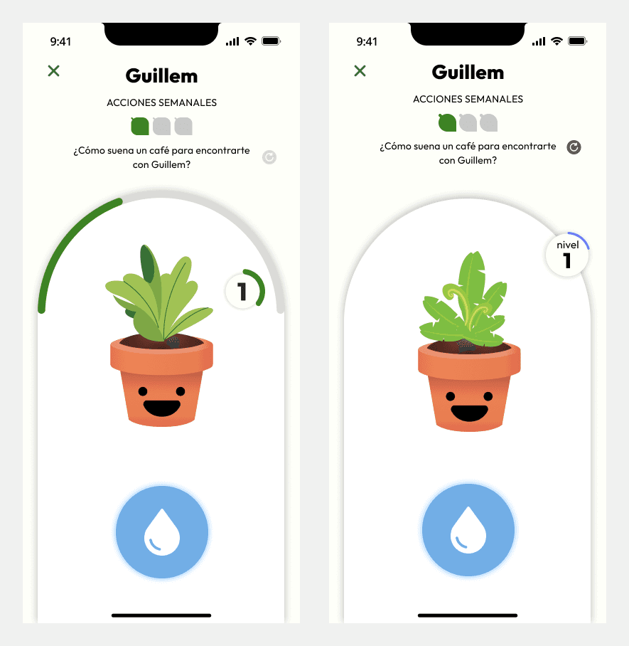 The plant screen was where users found the most difficulties, due to poorly designed elements. We opted to remove the status bar. Since the combination of minimal actions along with the visualization of the plant’s mood and health itself makes an additional status bar unnecessary. Previously, users misinterpreted this bar as a level indicator, expecting some event when completing it, rather than seeing it as a reflection of the plant’s status.