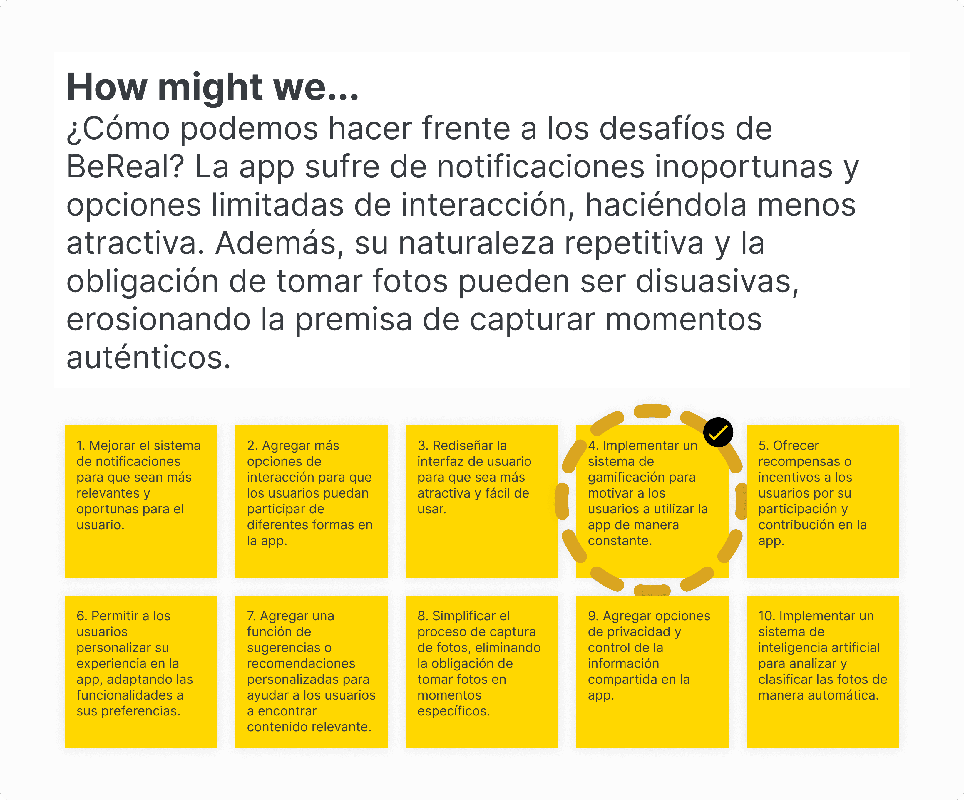 Desde el inicio del proyecto VWorld, la idea central era gamificar BeReal para crear una "avalancha de personas", al tiempo que se generaba contenido y se fortalecía la comunidad. Sin embargo, para asegurar que se exploraran todas las posibilidades, se adoptó la estrategia "HMW", que permitió identificar y evaluar diferentes propuestas.