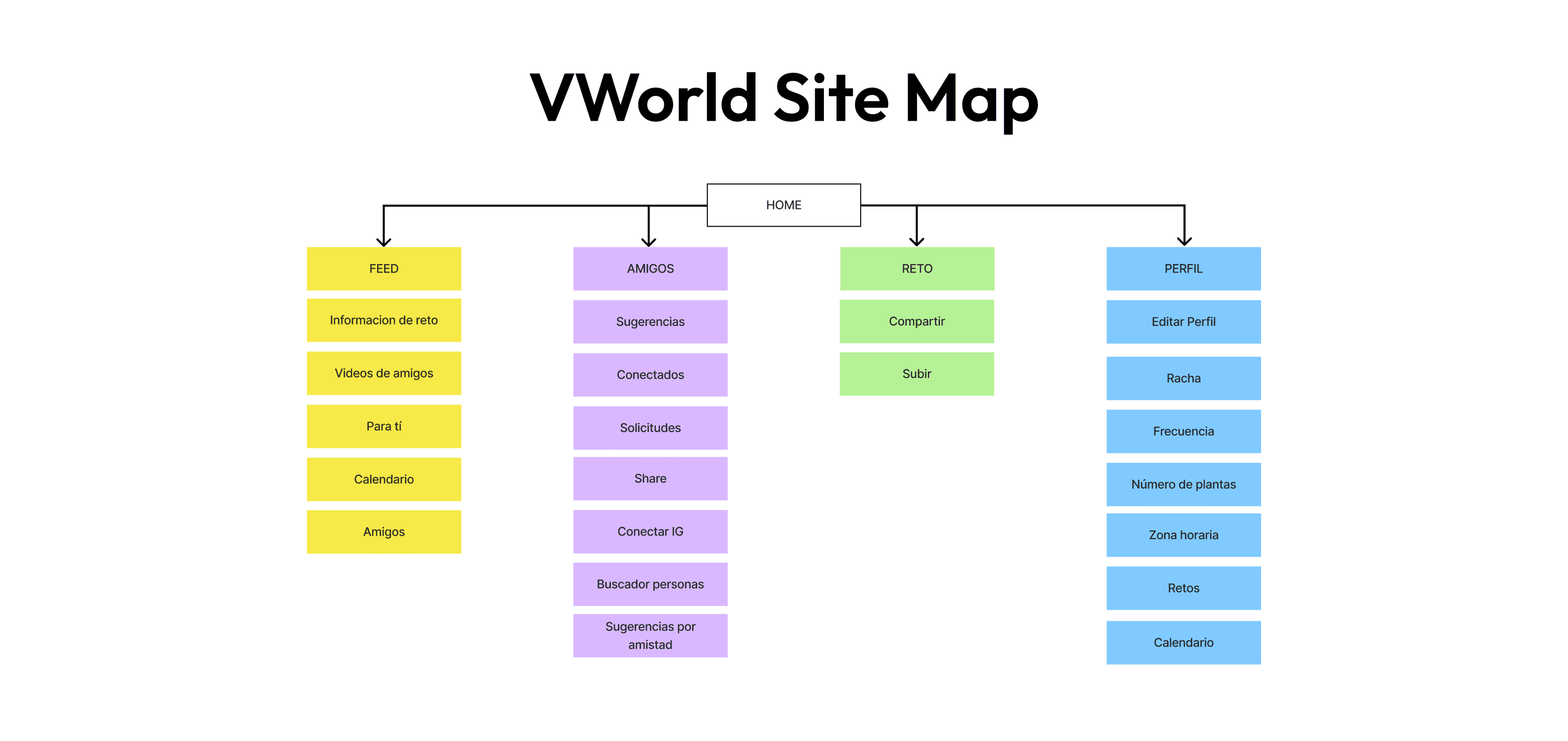 Tras un ejercicio de clasificación de tarjetas e ideación de features, se logró diseñar este Site Map. Este actúa como la columna vertebral de la app, diseñado para mejorar la navegación y facilitar el acceso a sus diversas funciones.