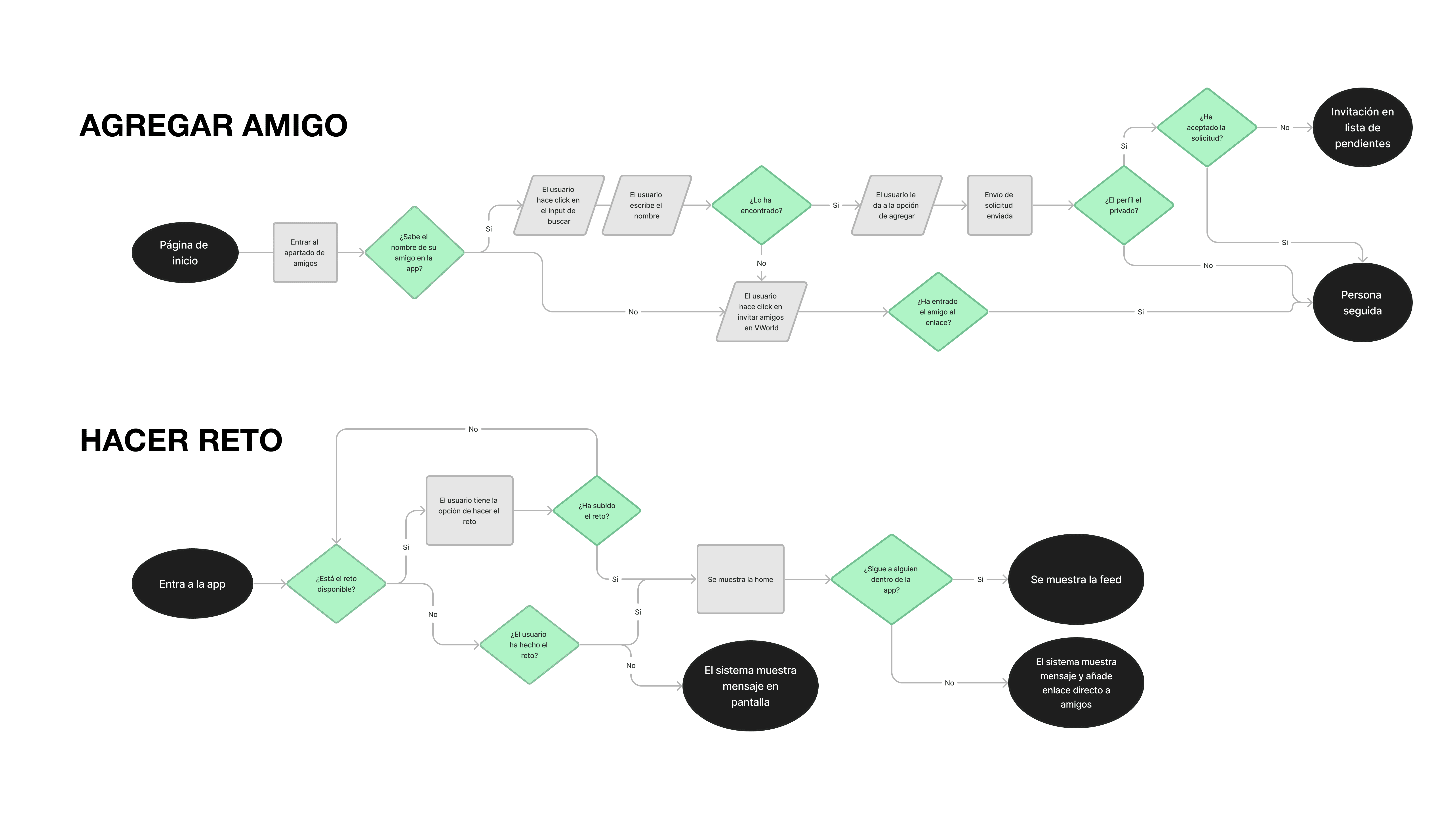 Se idearon diferentes task flows, estos son cruciales para la experiencia de usuario, en este caso 2 ejemplos: el proceso de agregar a un amigo y el proceso de realizar un reto.
