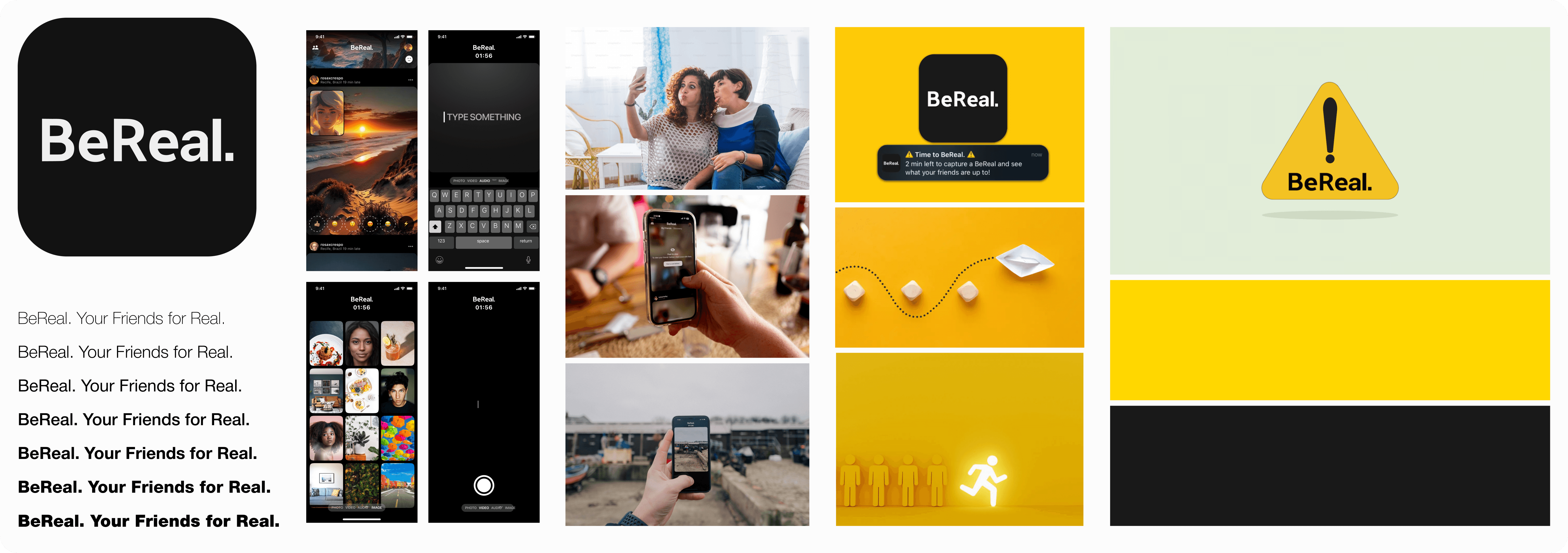 For the app’s mood board, elements that evoke action and alertness were selected, using yellow and orange colors, typical of warning signs. This allows it to stand out from the black and white tones used by BeReal, maintaining the same harmony but adding more strength, aggression, and personality.